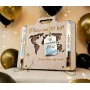 Otwierana walizka z życzeniami oraz kopertą w środku.